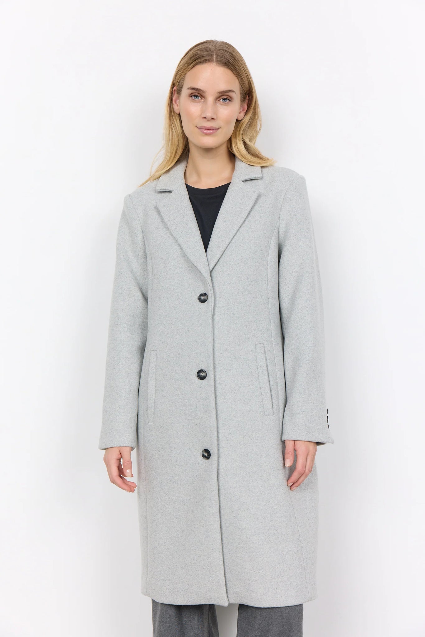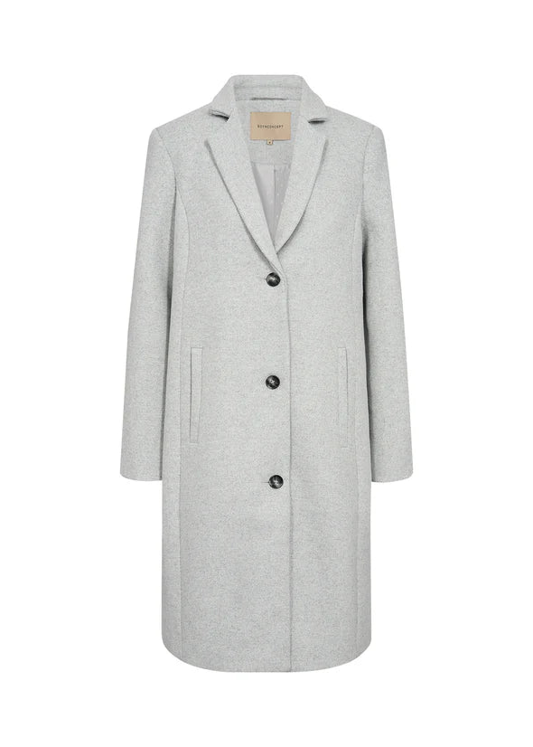 ASTA 2 is a long fashionable coat in a polyester and wool mix. It has three big buttons and a reverse collar. You can style this elegant coat with a warm scarf and big boots for the cold weather.