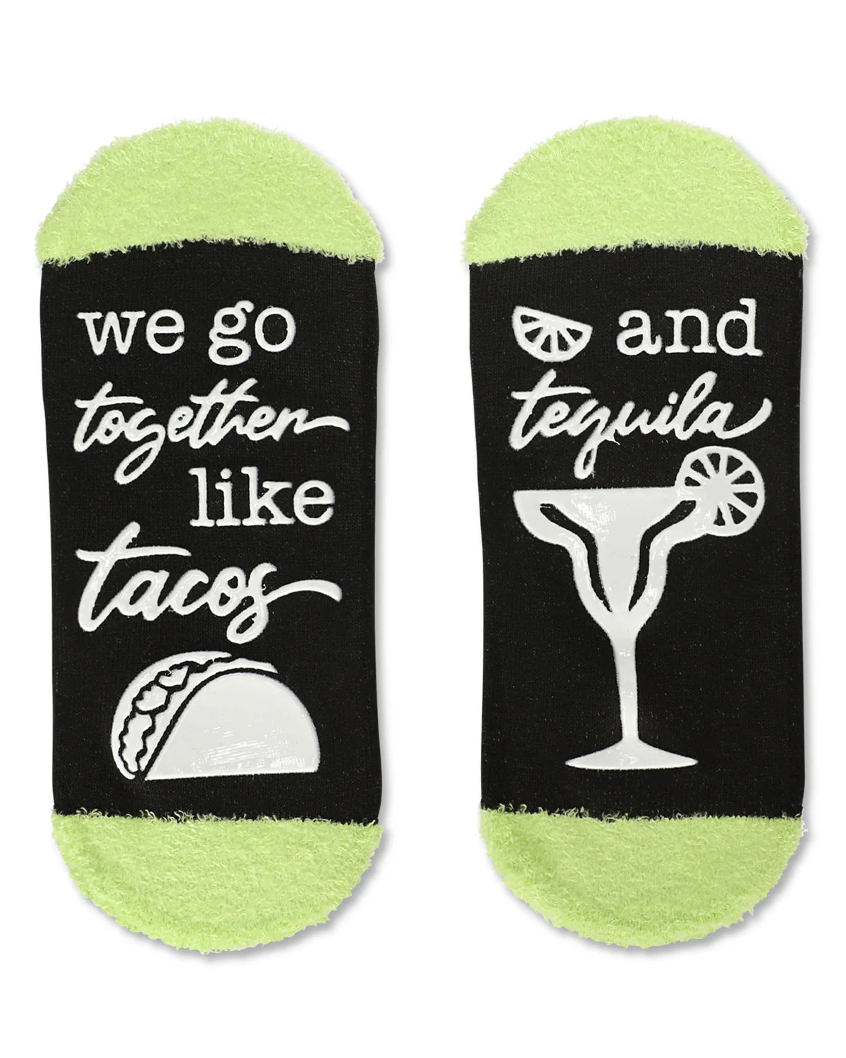 Talk about a perfect pair! Our Women's Tequila N Tacos Low Cut Socks are fun novelties you'll want to show off every Taco Tuesday. Part of our Wear Your Words Collection, these low cut socks sport the most delicious taco, with an extra large margarita on the front, and reads "We Go Together Like Tacos and Tequila," on the bottom. But that's not all, the saying also doubles as non-skid grippers to ensure a confident step. Featuring a contrasting heel, toe, and cuff, finished in a soft and fuzzy green knit that'll have you reaching for these time and time again.
