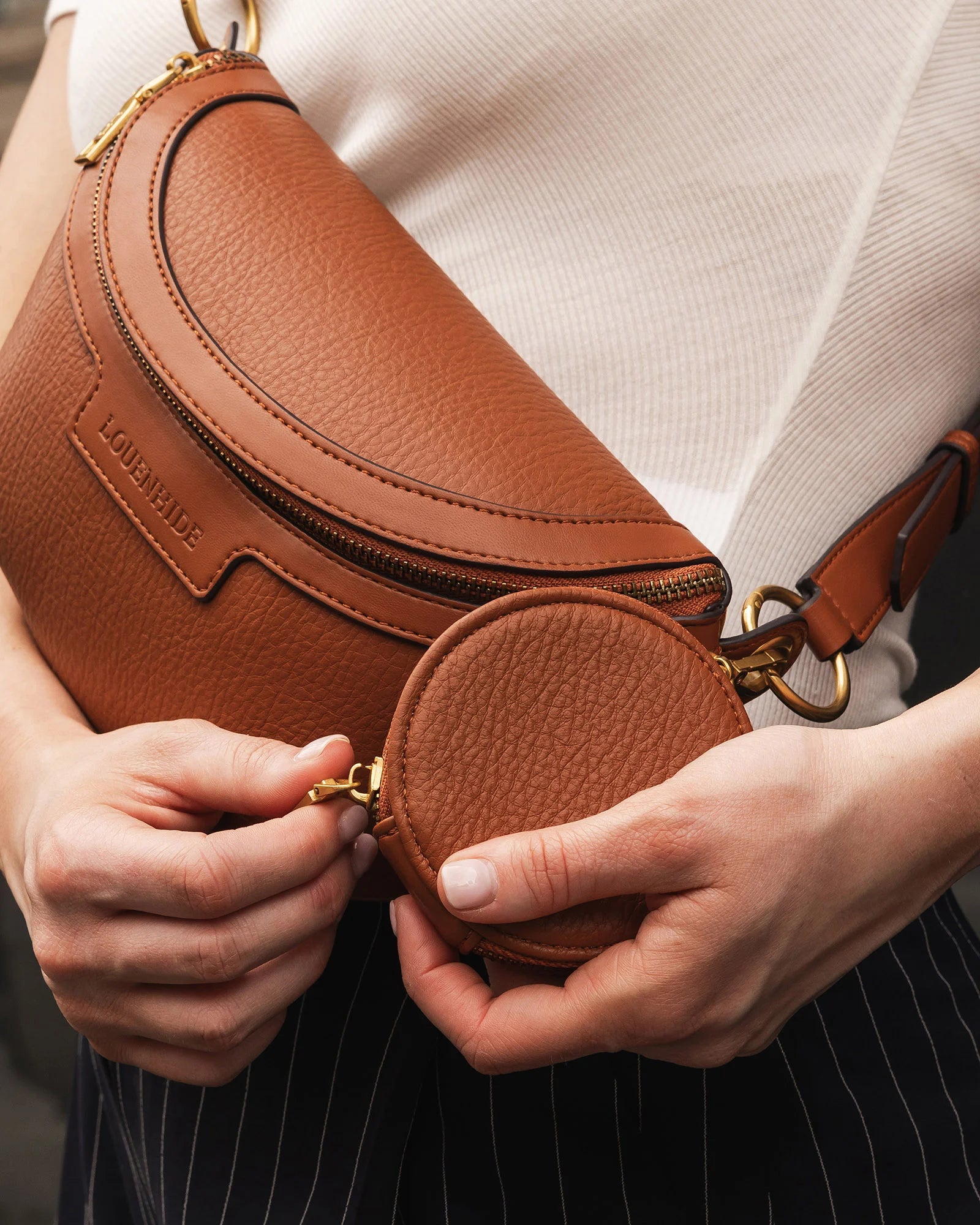 The Louenhide Joey Sling Bag is the epitome of convenience and style. This women’s bum bag is the perfect solution for the modern traveller who values both practicality and elegance. Keep your hands free to explore, snap photos or simply enjoy the journey knowing your essentials are conveniently within reach. The secure zip closure ensures your belongings stay safe and secure, while the gold hardware adds an elegant touch. The Joey also includes the perfect mini zip purse, ideal for your AirPods or favourite lip gloss. Elevate your travel experience and add the perfect women's accessory to your days on the go.