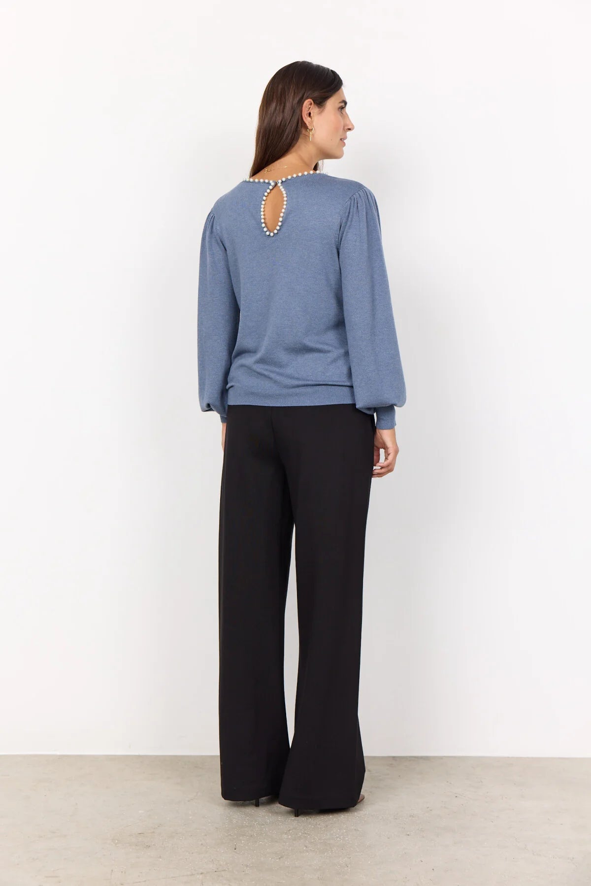 Dollie 773 is an elegant pullover made from a soft blend of viscose and elastane. The blouse has a round neckline, a droplet closure at the back, long balloon sleeves, a loose fit and beautiful pearl details. Style this lovely pullover with some tailored pants and a pair of heeled boots for an elegant look.