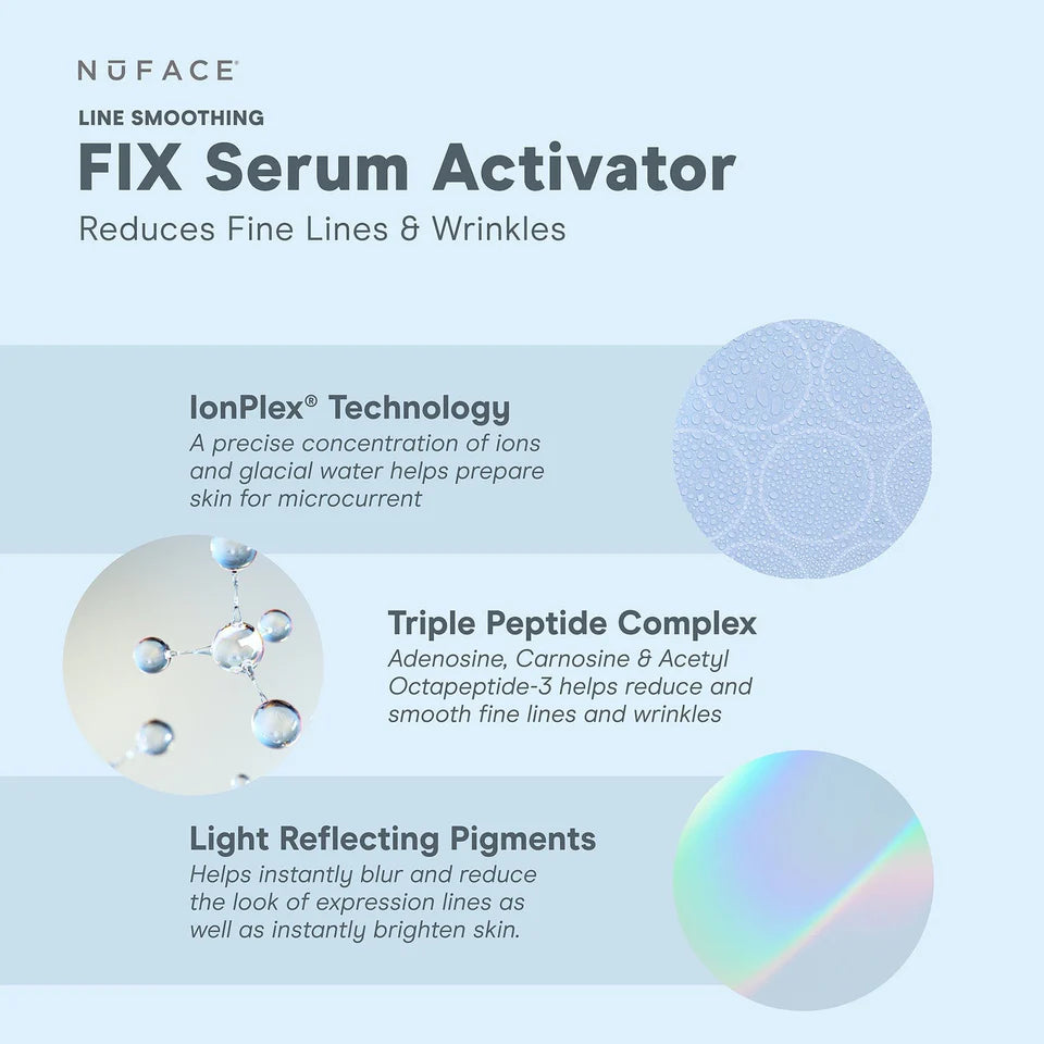 Your Device's Must-Have Partner - The FIX Serum Activator is a must-have for your FIX Line Smoothing Device, conducting the microcurrent from your device down to your skin, this hydrating serum helps to diminish the look of fine lines and wrinkles around your eyes and lips while instantly brightening your skin.