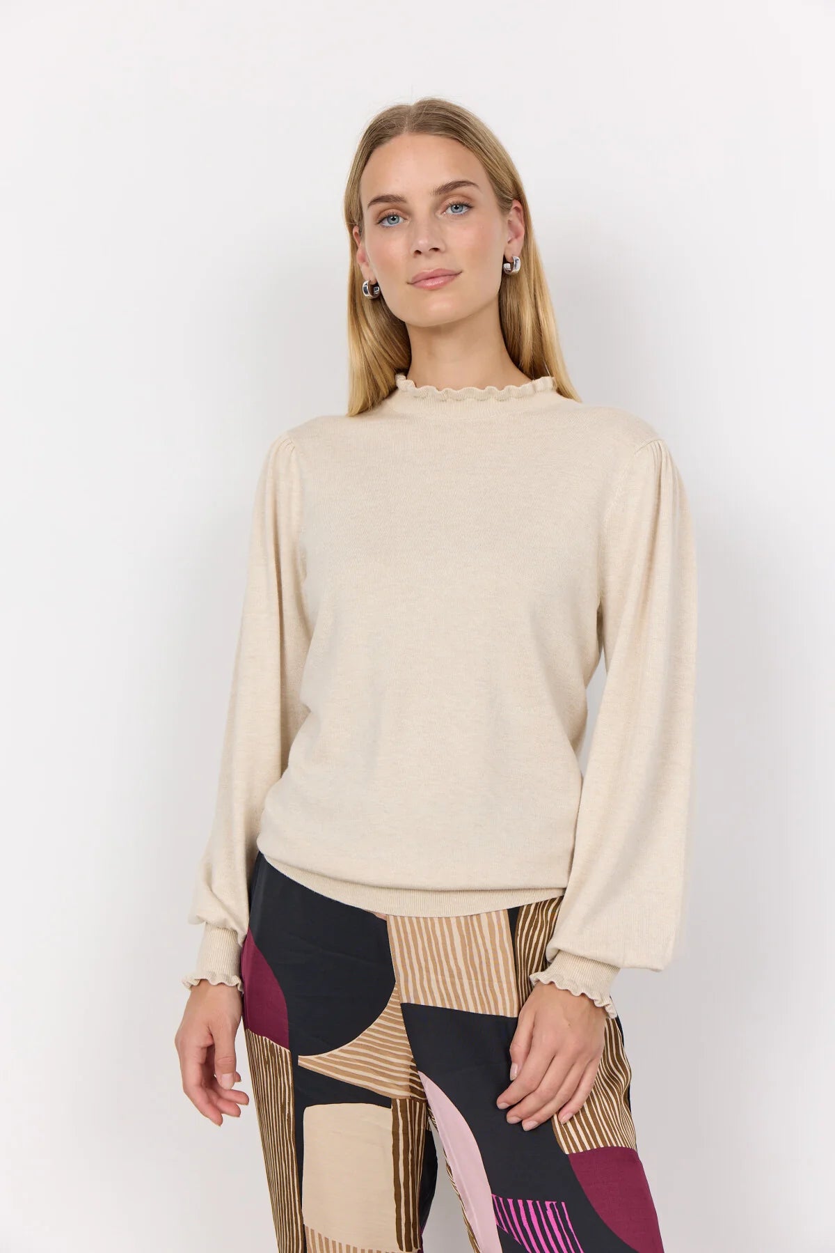 has a high neckline, long balloon sleeves, smock at the cuffs and a comfortable fit. Style this